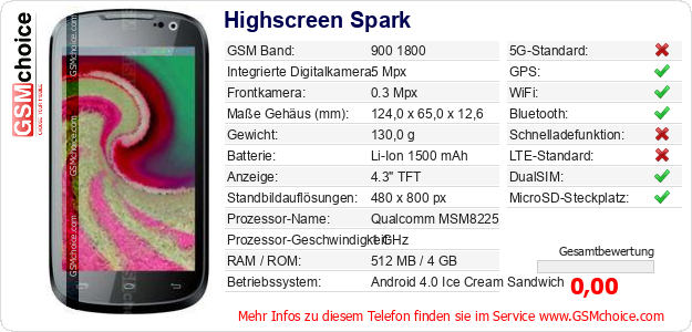 Hast du eigene Webseite? Willst du die Informationen über Standarddaten des Handys Highscreen Spark irgendwo veröffentlichen? Das ist sehr einfach. Du kannst das Bild herunterladen oder kopieren und auf der Webseite folgenden Code hinzufügen:Das Einfügen von diesem Code verursacht das Anzeigen von dem folgenden Bild: