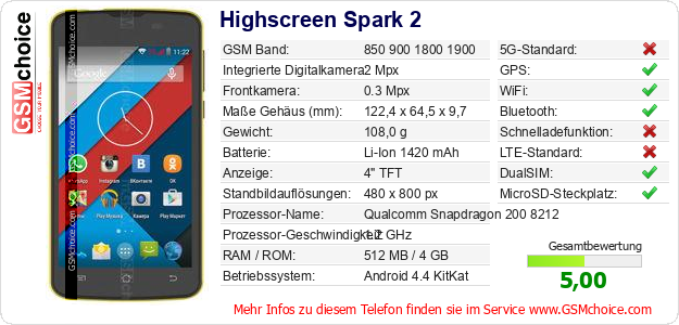 Hast du eigene Webseite? Willst du die Informationen über Standarddaten des Handys Highscreen Spark 2 irgendwo veröffentlichen? Das ist sehr einfach. Du kannst das Bild herunterladen oder kopieren und auf der Webseite folgenden Code hinzufügen:Das Einfügen von diesem Code verursacht das Anzeigen von dem folgenden Bild: