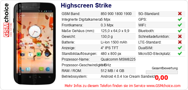 Hast du eigene Webseite? Willst du die Informationen über Standarddaten des Handys Highscreen Strike irgendwo veröffentlichen? Das ist sehr einfach. Du kannst das Bild herunterladen oder kopieren und auf der Webseite folgenden Code hinzufügen:Das Einfügen von diesem Code verursacht das Anzeigen von dem folgenden Bild: