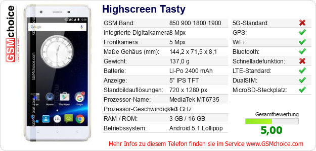 Hast du eigene Webseite? Willst du die Informationen über Standarddaten des Handys Highscreen Tasty irgendwo veröffentlichen? Das ist sehr einfach. Du kannst das Bild herunterladen oder kopieren und auf der Webseite folgenden Code hinzufügen:Das Einfügen von diesem Code verursacht das Anzeigen von dem folgenden Bild:
