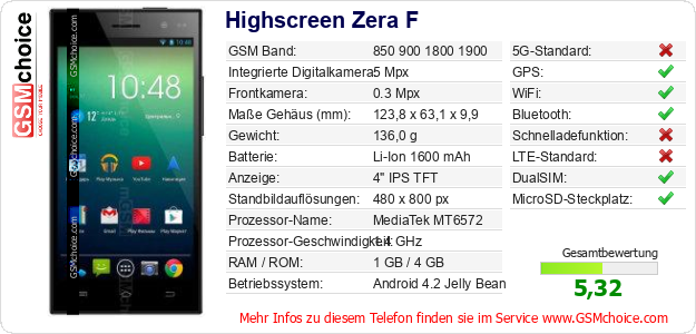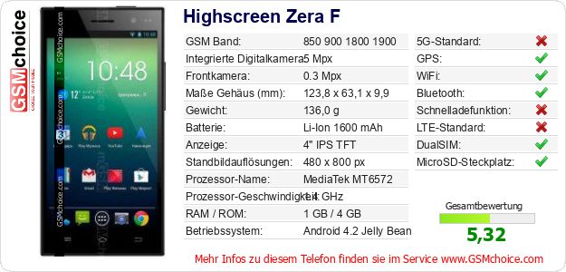 Hast du eigene Webseite? Willst du die Informationen über Standarddaten des Handys Highscreen Zera F irgendwo veröffentlichen? Das ist sehr einfach. Du kannst das Bild herunterladen oder kopieren und auf der Webseite folgenden Code hinzufügen:Das Einfügen von diesem Code verursacht das Anzeigen von dem folgenden Bild: