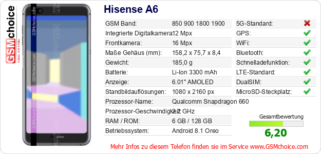 Hast du eigene Webseite? Willst du die Informationen über Standarddaten des Handys Hisense A6 irgendwo veröffentlichen? Das ist sehr einfach. Du kannst das Bild herunterladen oder kopieren und auf der Webseite folgenden Code hinzufügen:Das Einfügen von diesem Code verursacht das Anzeigen von dem folgenden Bild: