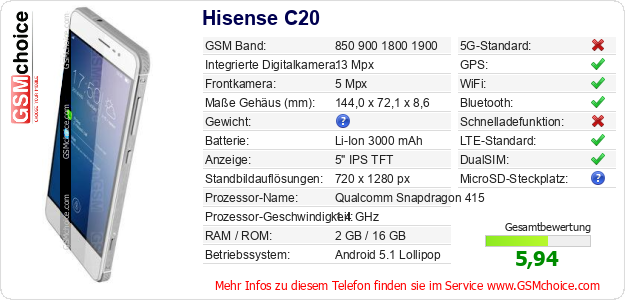 Hast du eigene Webseite? Willst du die Informationen über Standarddaten des Handys Hisense C20 irgendwo veröffentlichen? Das ist sehr einfach. Du kannst das Bild herunterladen oder kopieren und auf der Webseite folgenden Code hinzufügen:Das Einfügen von diesem Code verursacht das Anzeigen von dem folgenden Bild: