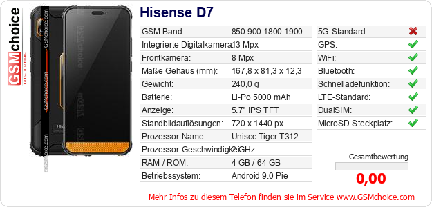Hast du eigene Webseite? Willst du die Informationen über Standarddaten des Handys Hisense D7 irgendwo veröffentlichen? Das ist sehr einfach. Du kannst das Bild herunterladen oder kopieren und auf der Webseite folgenden Code hinzufügen:Das Einfügen von diesem Code verursacht das Anzeigen von dem folgenden Bild: