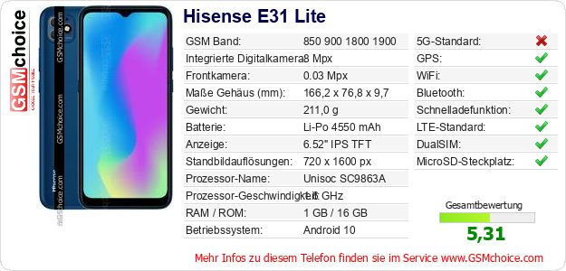 Hast du eigene Webseite? Willst du die Informationen über Standarddaten des Handys Hisense E31 Lite irgendwo veröffentlichen? Das ist sehr einfach. Du kannst das Bild herunterladen oder kopieren und auf der Webseite folgenden Code hinzufügen:Das Einfügen von diesem Code verursacht das Anzeigen von dem folgenden Bild: