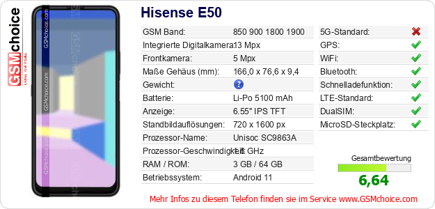 Hast du eigene Webseite? Willst du die Informationen über Standarddaten des Handys Hisense E50 irgendwo veröffentlichen? Das ist sehr einfach. Du kannst das Bild herunterladen oder kopieren und auf der Webseite folgenden Code hinzufügen:Das Einfügen von diesem Code verursacht das Anzeigen von dem folgenden Bild: