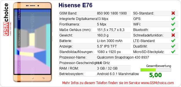 Hast du eigene Webseite? Willst du die Informationen über Standarddaten des Handys Hisense E76 irgendwo veröffentlichen? Das ist sehr einfach. Du kannst das Bild herunterladen oder kopieren und auf der Webseite folgenden Code hinzufügen:Das Einfügen von diesem Code verursacht das Anzeigen von dem folgenden Bild: