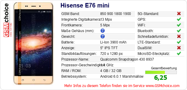 Hast du eigene Webseite? Willst du die Informationen über Standarddaten des Handys Hisense E76 mini irgendwo veröffentlichen? Das ist sehr einfach. Du kannst das Bild herunterladen oder kopieren und auf der Webseite folgenden Code hinzufügen:Das Einfügen von diesem Code verursacht das Anzeigen von dem folgenden Bild: