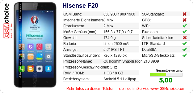 Hast du eigene Webseite? Willst du die Informationen über Standarddaten des Handys Hisense F20 irgendwo veröffentlichen? Das ist sehr einfach. Du kannst das Bild herunterladen oder kopieren und auf der Webseite folgenden Code hinzufügen:Das Einfügen von diesem Code verursacht das Anzeigen von dem folgenden Bild: