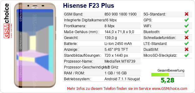 Hast du eigene Webseite? Willst du die Informationen über Standarddaten des Handys Hisense F23 Plus irgendwo veröffentlichen? Das ist sehr einfach. Du kannst das Bild herunterladen oder kopieren und auf der Webseite folgenden Code hinzufügen:Das Einfügen von diesem Code verursacht das Anzeigen von dem folgenden Bild: