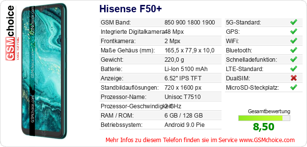Hast du eigene Webseite? Willst du die Informationen über Standarddaten des Handys Hisense F50+ irgendwo veröffentlichen? Das ist sehr einfach. Du kannst das Bild herunterladen oder kopieren und auf der Webseite folgenden Code hinzufügen:Das Einfügen von diesem Code verursacht das Anzeigen von dem folgenden Bild:
