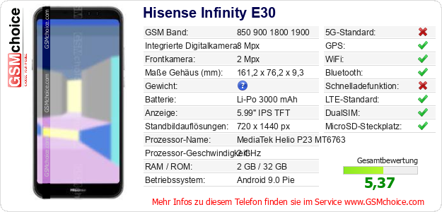 Daten des Mobiltelefons Hisense Infinity E30 auf Ihrer Seite
