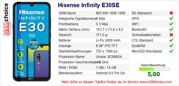 Hast du eigene Webseite? Willst du die Informationen über Standarddaten des Handys Hisense Infinity E30SE irgendwo veröffentlichen? Das ist sehr einfach. Du kannst das Bild herunterladen oder kopieren und auf der Webseite folgenden Code hinzufügen:Das Einfügen von diesem Code verursacht das Anzeigen von dem folgenden Bild: