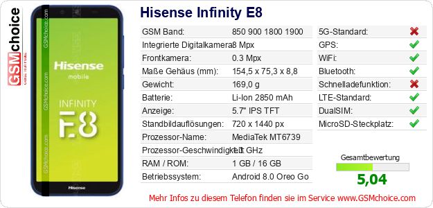 Hast du eigene Webseite? Willst du die Informationen über Standarddaten des Handys Hisense Infinity E8 irgendwo veröffentlichen? Das ist sehr einfach. Du kannst das Bild herunterladen oder kopieren und auf der Webseite folgenden Code hinzufügen:Das Einfügen von diesem Code verursacht das Anzeigen von dem folgenden Bild: