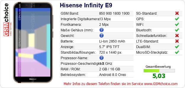 Hast du eigene Webseite? Willst du die Informationen über Standarddaten des Handys Hisense Infinity E9 irgendwo veröffentlichen? Das ist sehr einfach. Du kannst das Bild herunterladen oder kopieren und auf der Webseite folgenden Code hinzufügen:Das Einfügen von diesem Code verursacht das Anzeigen von dem folgenden Bild:
