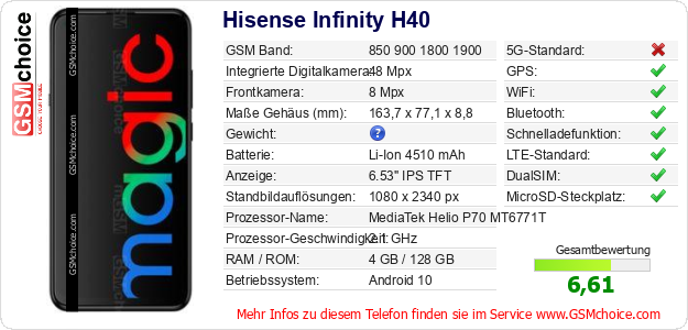 Hast du eigene Webseite? Willst du die Informationen über Standarddaten des Handys Hisense Infinity H40 irgendwo veröffentlichen? Das ist sehr einfach. Du kannst das Bild herunterladen oder kopieren und auf der Webseite folgenden Code hinzufügen:Das Einfügen von diesem Code verursacht das Anzeigen von dem folgenden Bild: