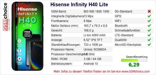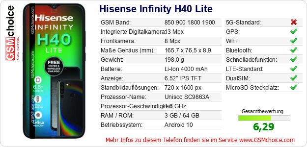 Hast du eigene Webseite? Willst du die Informationen über Standarddaten des Handys Hisense Infinity H40 Lite irgendwo veröffentlichen? Das ist sehr einfach. Du kannst das Bild herunterladen oder kopieren und auf der Webseite folgenden Code hinzufügen:Das Einfügen von diesem Code verursacht das Anzeigen von dem folgenden Bild: