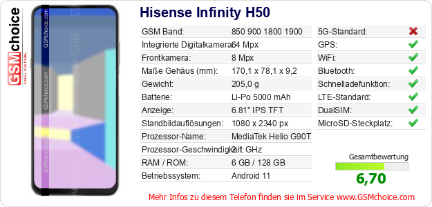 Hast du eigene Webseite? Willst du die Informationen über Standarddaten des Handys Hisense Infinity H50 irgendwo veröffentlichen? Das ist sehr einfach. Du kannst das Bild herunterladen oder kopieren und auf der Webseite folgenden Code hinzufügen:Das Einfügen von diesem Code verursacht das Anzeigen von dem folgenden Bild: