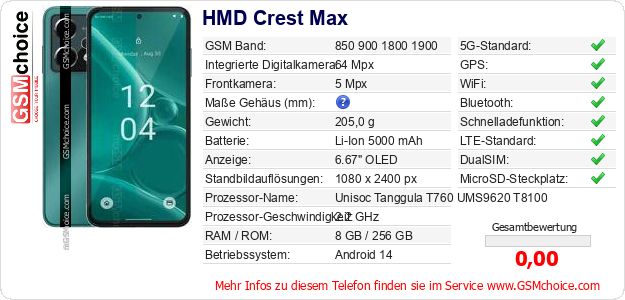 Hast du eigene Webseite? Willst du die Informationen über Standarddaten des Handys HMD Crest Max irgendwo veröffentlichen? Das ist sehr einfach. Du kannst das Bild herunterladen oder kopieren und auf der Webseite folgenden Code hinzufügen:Das Einfügen von diesem Code verursacht das Anzeigen von dem folgenden Bild: