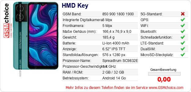 Hast du eigene Webseite? Willst du die Informationen über Standarddaten des Handys HMD Key irgendwo veröffentlichen? Das ist sehr einfach. Du kannst das Bild herunterladen oder kopieren und auf der Webseite folgenden Code hinzufügen:Das Einfügen von diesem Code verursacht das Anzeigen von dem folgenden Bild: