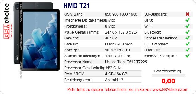 Hast du eigene Webseite? Willst du die Informationen über Standarddaten des Handys HMD T21 irgendwo veröffentlichen? Das ist sehr einfach. Du kannst das Bild herunterladen oder kopieren und auf der Webseite folgenden Code hinzufügen:Das Einfügen von diesem Code verursacht das Anzeigen von dem folgenden Bild: