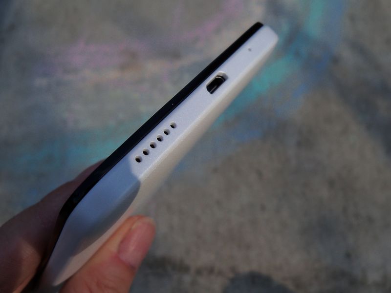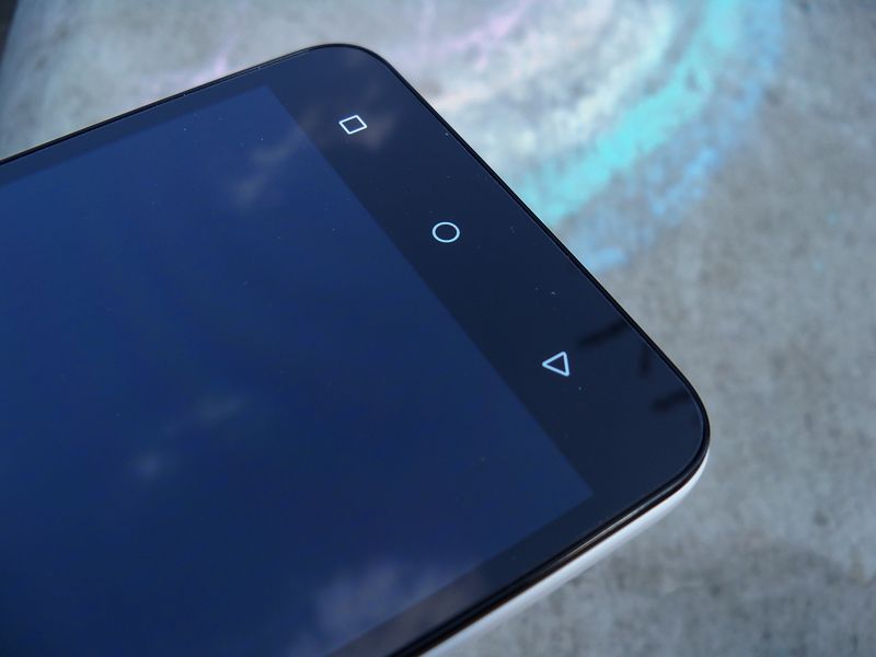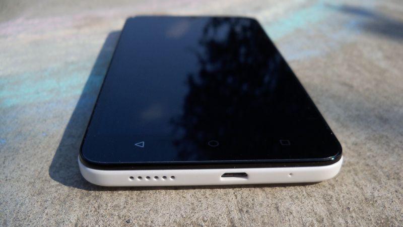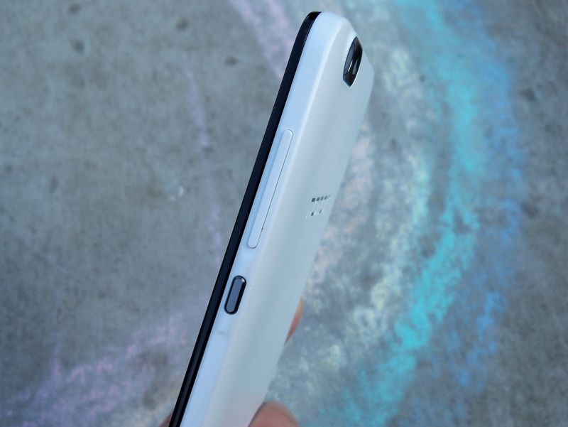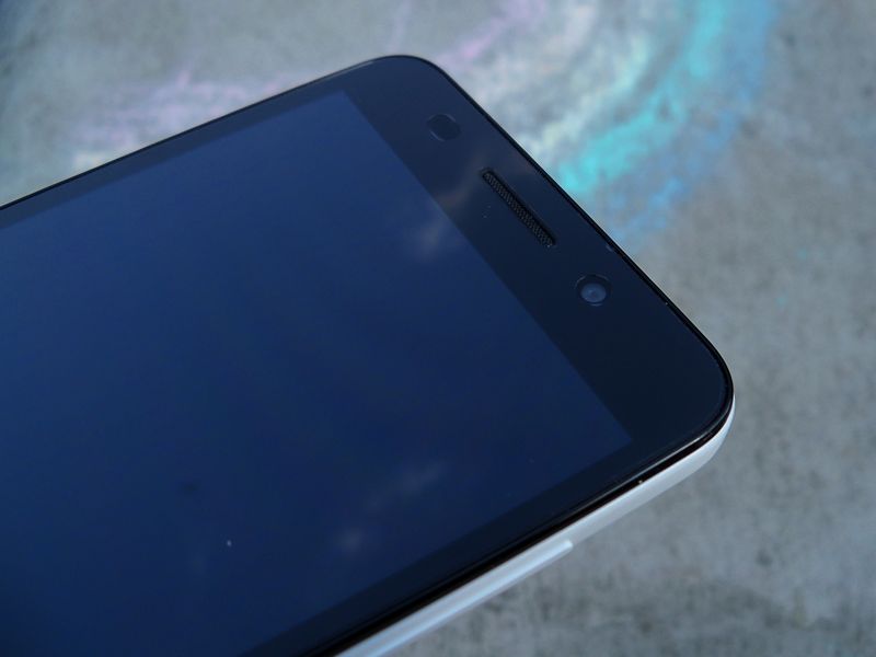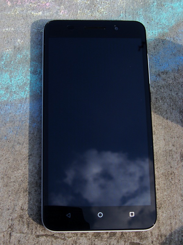 Das 5,5-Zoll-Display ist mit dem schwarzen Rahmen umgeben. Unter dem Display befinden sich zusätzliche Systemtasten, leider ohne Hintergrundbeleuchtung. Im oberen Teil des Frontpanels haben wir wiederum einen Lautsprecher des Telefons, eine Benachrichtigungsdiode, einen Sensor und eine 5-Megapixel-Kamera zur Videogespräche oder Selfies. An den Rändern wurde eine Kopfhörerbuchse (oben), ein microUSB-Slot, die Öffnungen des externen Lautsprechers und eine Öffnung des Mikrofons (unten) und physische Lautstärkeregulierungstasten und ein Sperr/Powerbutton des Telefons (an dem rechten Rand, gut spürbare Buttons, eins in weißer Farbe, zweiter in der dunklen Farbe) platziert.