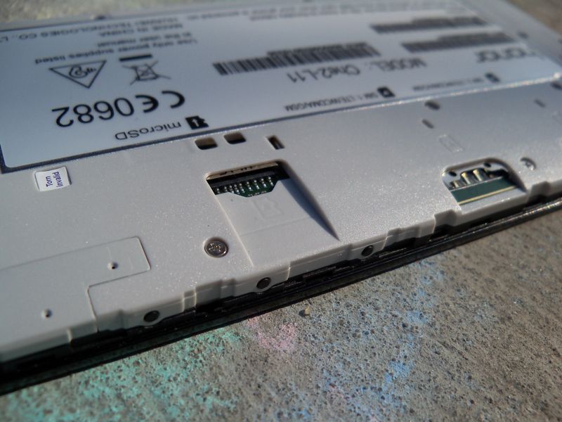 Der Akkudeckel ist weiß und dank der texturierten Oberfläche rutscht das Telefon aus der Hand nicht und es werden keine Fingerabdrücke sichtbar. Die Rückseite ist traditionell ein Platz, wo wir eine Hauptkamera zusammen mit einer Blitzdiode finden. Es gibt hier ein Logo des Herstellers. Nach der Entfernung des Panels bekommen wir einen Zugang zu den zwei SIM-Karten-Steckplätze in der Micro-Größe und einen Steckplatz für die Speicherkarte. Es stellt sich heraus, dass der Akku, aus der Sicht des Benutzers, nicht austauschbarist.