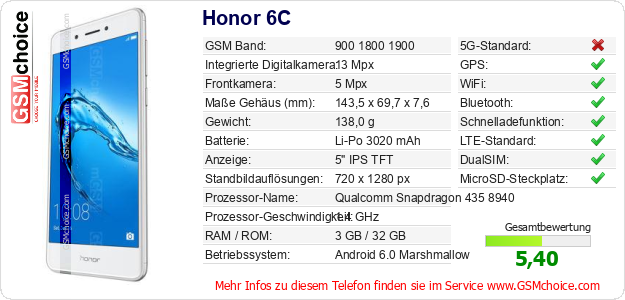 Hast du eigene Webseite? Willst du die Informationen über Standarddaten des Handys Honor 6C irgendwo veröffentlichen? Das ist sehr einfach. Du kannst das Bild herunterladen oder kopieren und auf der Webseite folgenden Code hinzufügen:Das Einfügen von diesem Code verursacht das Anzeigen von dem folgenden Bild: