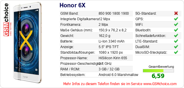 Hast du eigene Webseite? Willst du die Informationen über Standarddaten des Handys Honor 6X irgendwo veröffentlichen? Das ist sehr einfach. Du kannst das Bild herunterladen oder kopieren und auf der Webseite folgenden Code hinzufügen:Das Einfügen von diesem Code verursacht das Anzeigen von dem folgenden Bild: