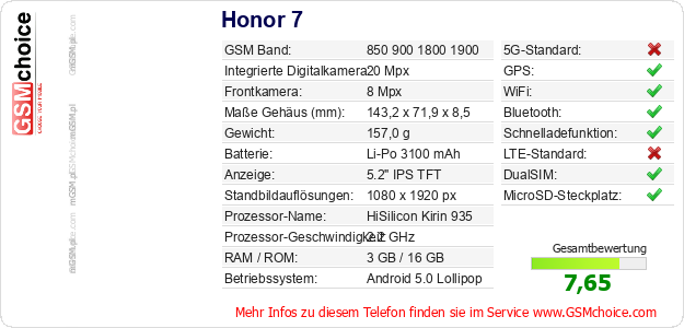 Hast du eigene Webseite? Willst du die Informationen über Standarddaten des Handys Honor 7 irgendwo veröffentlichen? Das ist sehr einfach. Du kannst das Bild herunterladen oder kopieren und auf der Webseite folgenden Code hinzufügen:Das Einfügen von diesem Code verursacht das Anzeigen von dem folgenden Bild: