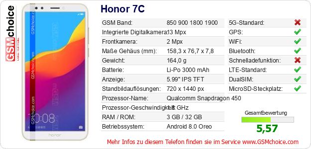 Hast du eigene Webseite? Willst du die Informationen über Standarddaten des Handys Honor 7C irgendwo veröffentlichen? Das ist sehr einfach. Du kannst das Bild herunterladen oder kopieren und auf der Webseite folgenden Code hinzufügen:Das Einfügen von diesem Code verursacht das Anzeigen von dem folgenden Bild: