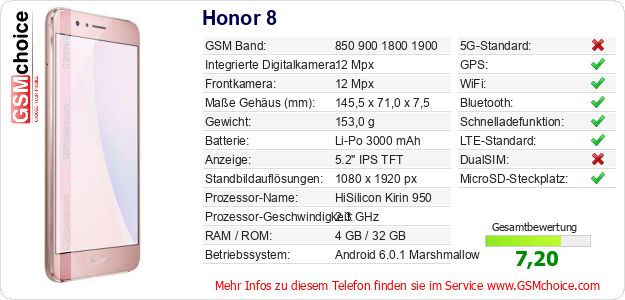 Hast du eigene Webseite? Willst du die Informationen über Standarddaten des Handys Honor 8 irgendwo veröffentlichen? Das ist sehr einfach. Du kannst das Bild herunterladen oder kopieren und auf der Webseite folgenden Code hinzufügen:Das Einfügen von diesem Code verursacht das Anzeigen von dem folgenden Bild: