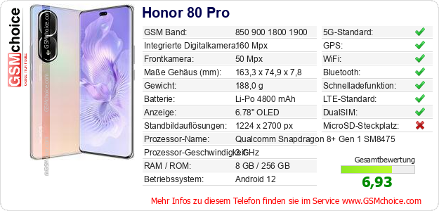 Hast du eigene Webseite? Willst du die Informationen über Standarddaten des Handys Honor 80 Pro irgendwo veröffentlichen? Das ist sehr einfach. Du kannst das Bild herunterladen oder kopieren und auf der Webseite folgenden Code hinzufügen:Das Einfügen von diesem Code verursacht das Anzeigen von dem folgenden Bild: