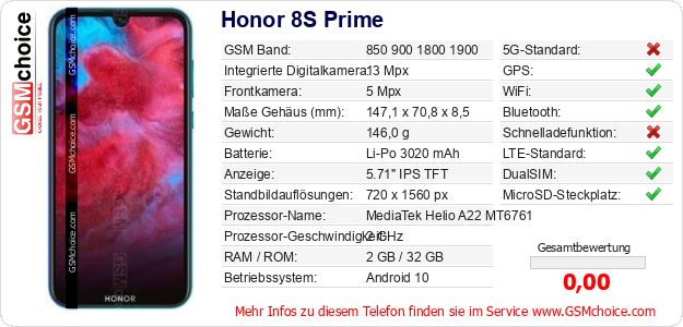 Hast du eigene Webseite? Willst du die Informationen über Standarddaten des Handys Honor 8S Prime irgendwo veröffentlichen? Das ist sehr einfach. Du kannst das Bild herunterladen oder kopieren und auf der Webseite folgenden Code hinzufügen:Das Einfügen von diesem Code verursacht das Anzeigen von dem folgenden Bild: