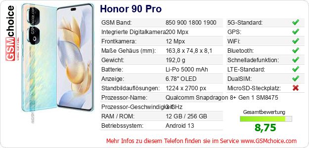 Daten des Mobiltelefons Honor 90 Pro auf Ihrer Seite