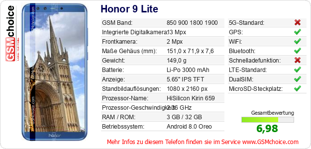 Hast du eigene Webseite? Willst du die Informationen über Standarddaten des Handys Honor 9 Lite irgendwo veröffentlichen? Das ist sehr einfach. Du kannst das Bild herunterladen oder kopieren und auf der Webseite folgenden Code hinzufügen:Das Einfügen von diesem Code verursacht das Anzeigen von dem folgenden Bild: