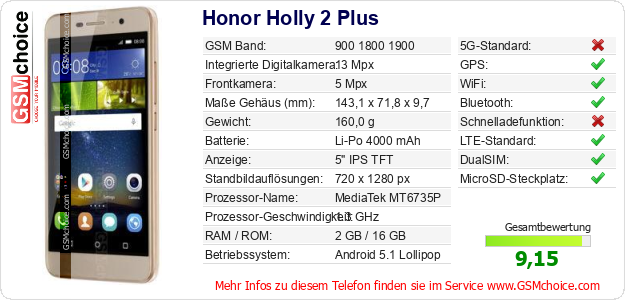 Hast du eigene Webseite? Willst du die Informationen über Standarddaten des Handys Honor Holly 2 Plus irgendwo veröffentlichen? Das ist sehr einfach. Du kannst das Bild herunterladen oder kopieren und auf der Webseite folgenden Code hinzufügen:Das Einfügen von diesem Code verursacht das Anzeigen von dem folgenden Bild: