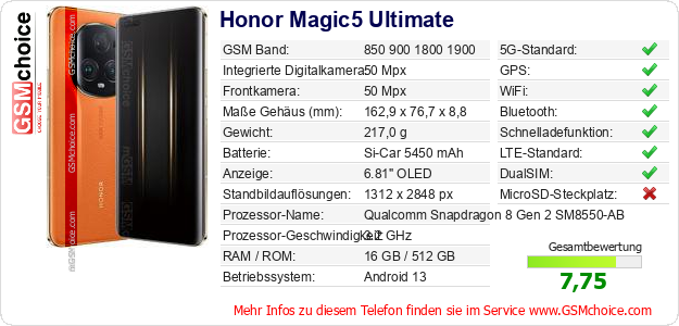 Hast du eigene Webseite? Willst du die Informationen über Standarddaten des Handys Honor Magic5 Ultimate irgendwo veröffentlichen? Das ist sehr einfach. Du kannst das Bild herunterladen oder kopieren und auf der Webseite folgenden Code hinzufügen:Das Einfügen von diesem Code verursacht das Anzeigen von dem folgenden Bild: