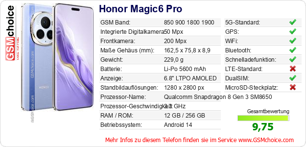 Hast du eigene Webseite? Willst du die Informationen über Standarddaten des Handys Honor Magic6 Pro irgendwo veröffentlichen? Das ist sehr einfach. Du kannst das Bild herunterladen oder kopieren und auf der Webseite folgenden Code hinzufügen:Das Einfügen von diesem Code verursacht das Anzeigen von dem folgenden Bild: