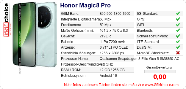 Hast du eigene Webseite? Willst du die Informationen über Standarddaten des Handys Honor Magic8 Pro irgendwo veröffentlichen? Das ist sehr einfach. Du kannst das Bild herunterladen oder kopieren und auf der Webseite folgenden Code hinzufügen:Das Einfügen von diesem Code verursacht das Anzeigen von dem folgenden Bild: