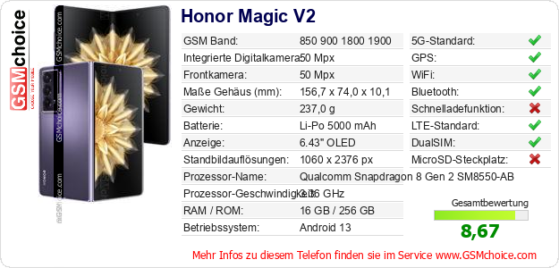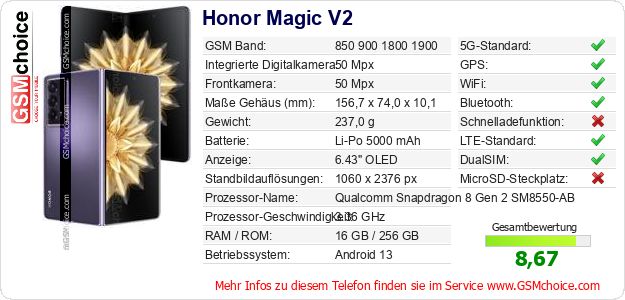 Hast du eigene Webseite? Willst du die Informationen über Standarddaten des Handys Honor Magic V2 irgendwo veröffentlichen? Das ist sehr einfach. Du kannst das Bild herunterladen oder kopieren und auf der Webseite folgenden Code hinzufügen:Das Einfügen von diesem Code verursacht das Anzeigen von dem folgenden Bild: