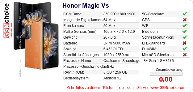 Hast du eigene Webseite? Willst du die Informationen über Standarddaten des Handys Honor Magic Vs irgendwo veröffentlichen? Das ist sehr einfach. Du kannst das Bild herunterladen oder kopieren und auf der Webseite folgenden Code hinzufügen:Das Einfügen von diesem Code verursacht das Anzeigen von dem folgenden Bild: