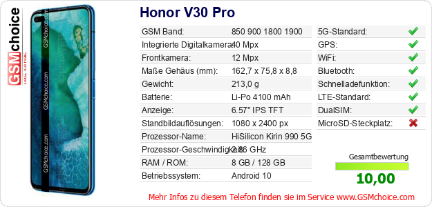Hast du eigene Webseite? Willst du die Informationen über Standarddaten des Handys Honor V30 Pro irgendwo veröffentlichen? Das ist sehr einfach. Du kannst das Bild herunterladen oder kopieren und auf der Webseite folgenden Code hinzufügen:Das Einfügen von diesem Code verursacht das Anzeigen von dem folgenden Bild: