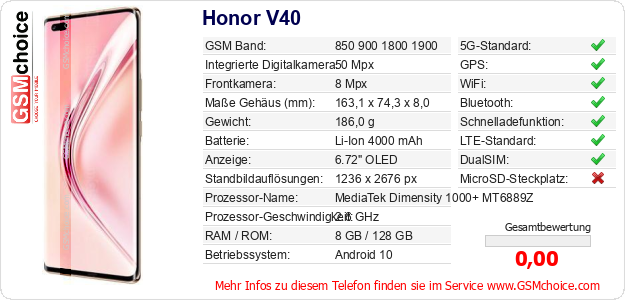 Hast du eigene Webseite? Willst du die Informationen über Standarddaten des Handys Honor V40 irgendwo veröffentlichen? Das ist sehr einfach. Du kannst das Bild herunterladen oder kopieren und auf der Webseite folgenden Code hinzufügen:Das Einfügen von diesem Code verursacht das Anzeigen von dem folgenden Bild: