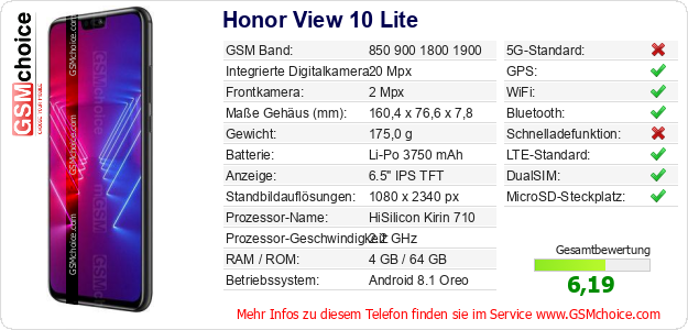 Hast du eigene Webseite? Willst du die Informationen über Standarddaten des Handys Honor View 10 Lite irgendwo veröffentlichen? Das ist sehr einfach. Du kannst das Bild herunterladen oder kopieren und auf der Webseite folgenden Code hinzufügen:Das Einfügen von diesem Code verursacht das Anzeigen von dem folgenden Bild: