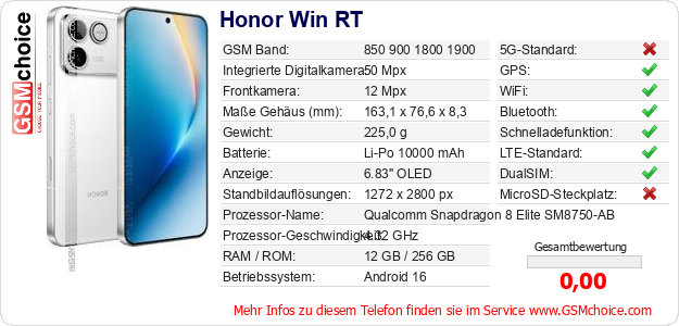 Hast du eigene Webseite? Willst du die Informationen über Standarddaten des Handys Honor Win RT irgendwo veröffentlichen? Das ist sehr einfach. Du kannst das Bild herunterladen oder kopieren und auf der Webseite folgenden Code hinzufügen:Das Einfügen von diesem Code verursacht das Anzeigen von dem folgenden Bild: