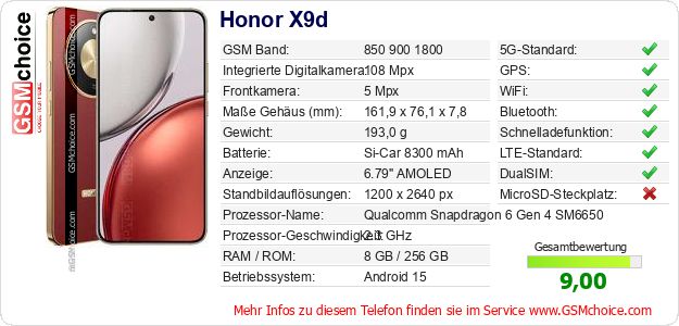 Hast du eigene Webseite? Willst du die Informationen über Standarddaten des Handys Honor X9d irgendwo veröffentlichen? Das ist sehr einfach. Du kannst das Bild herunterladen oder kopieren und auf der Webseite folgenden Code hinzufügen:Das Einfügen von diesem Code verursacht das Anzeigen von dem folgenden Bild: