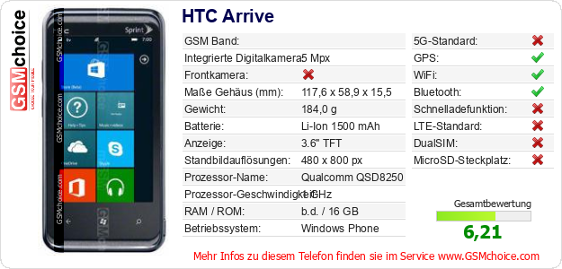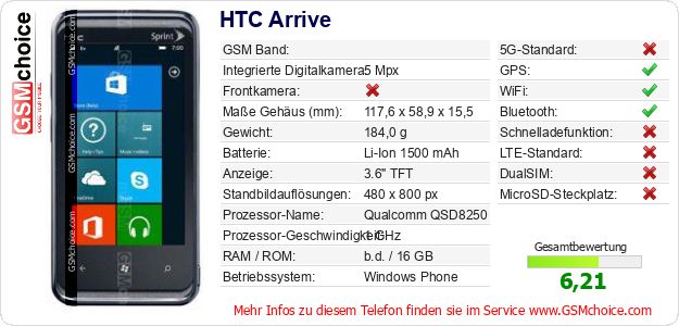 Hast du eigene Webseite? Willst du die Informationen über Standarddaten des Handys HTC Arrive irgendwo veröffentlichen? Das ist sehr einfach. Du kannst das Bild herunterladen oder kopieren und auf der Webseite folgenden Code hinzufügen:Das Einfügen von diesem Code verursacht das Anzeigen von dem folgenden Bild: