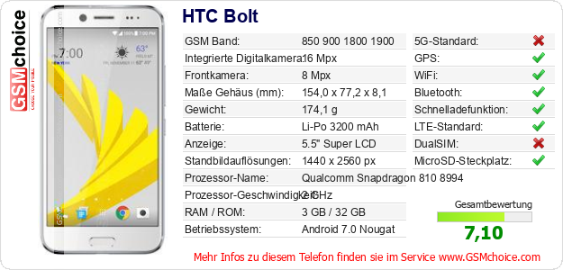 Hast du eigene Webseite? Willst du die Informationen über Standarddaten des Handys HTC Bolt irgendwo veröffentlichen? Das ist sehr einfach. Du kannst das Bild herunterladen oder kopieren und auf der Webseite folgenden Code hinzufügen:Das Einfügen von diesem Code verursacht das Anzeigen von dem folgenden Bild: