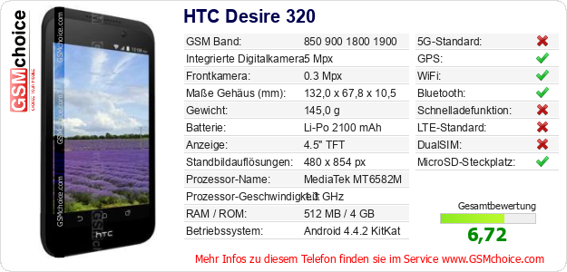 Hast du eigene Webseite? Willst du die Informationen über Standarddaten des Handys HTC Desire 320 irgendwo veröffentlichen? Das ist sehr einfach. Du kannst das Bild herunterladen oder kopieren und auf der Webseite folgenden Code hinzufügen:Das Einfügen von diesem Code verursacht das Anzeigen von dem folgenden Bild: